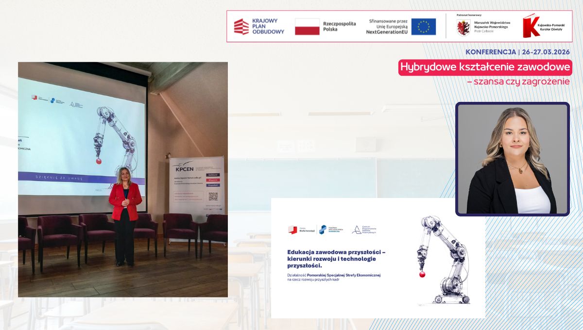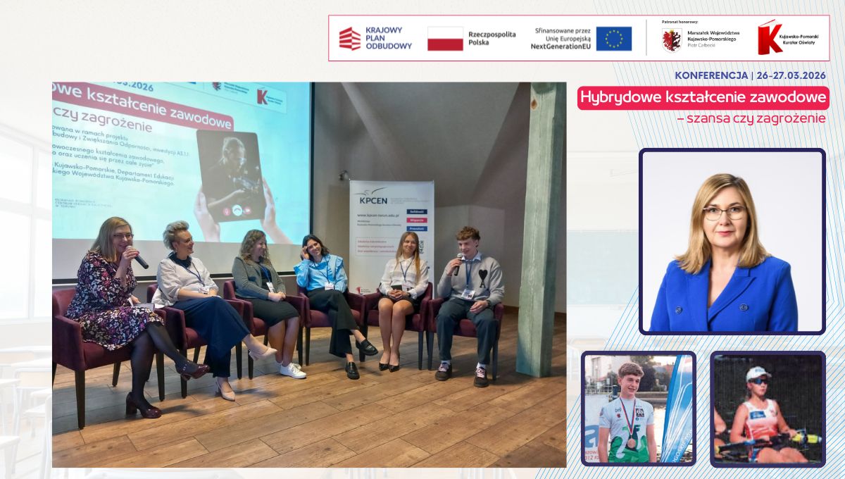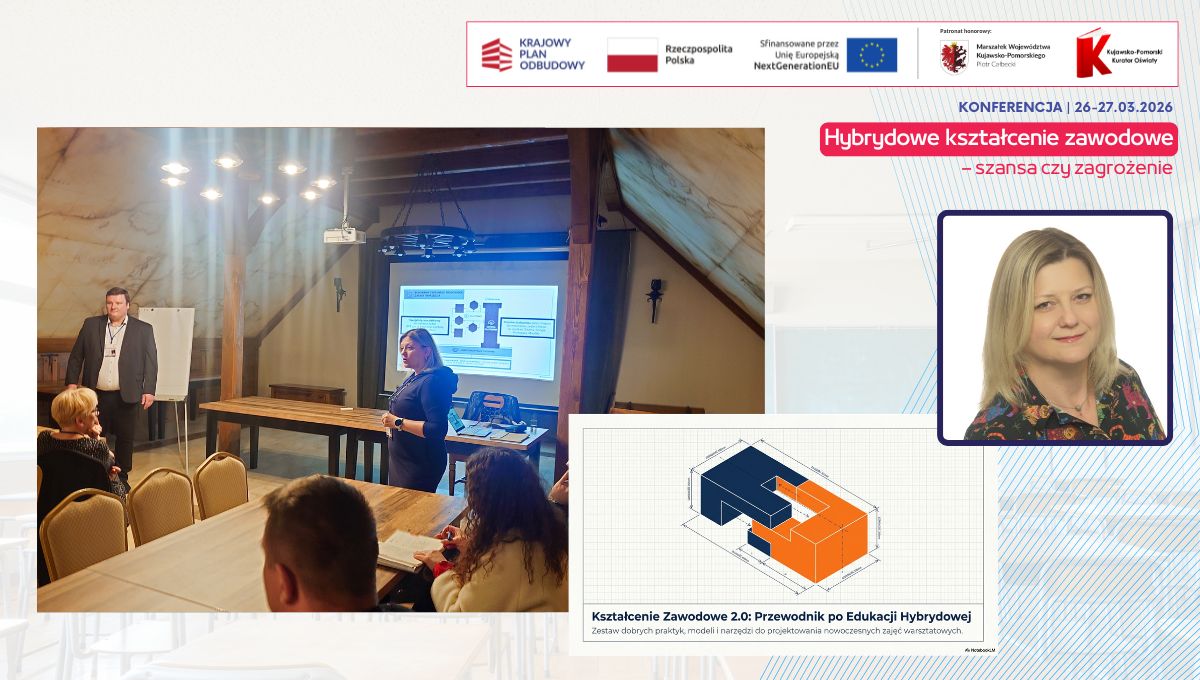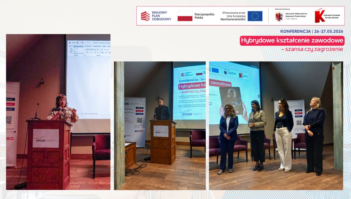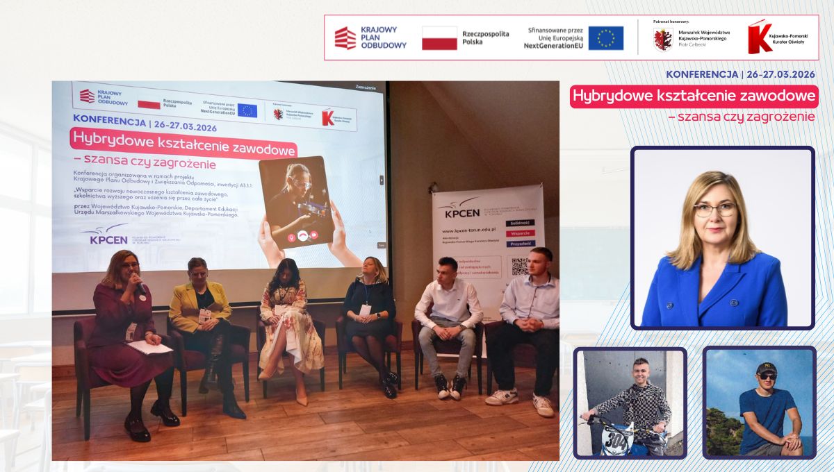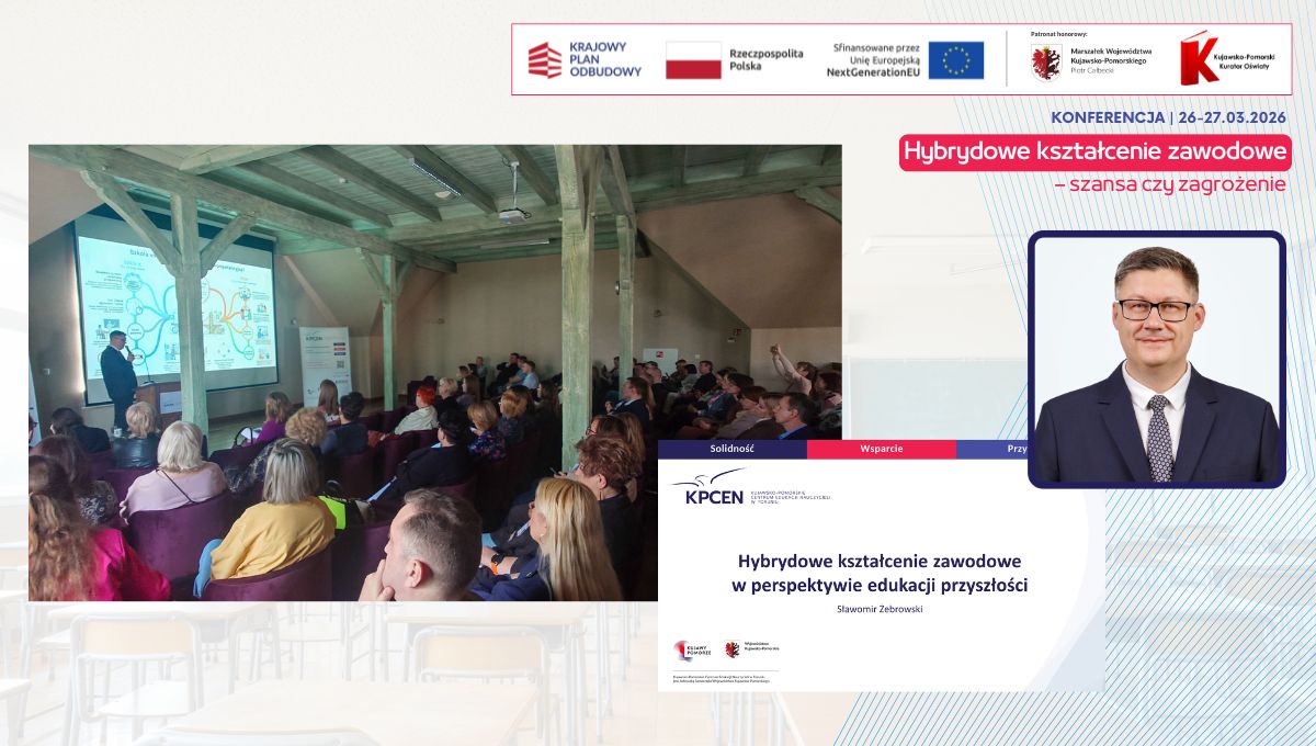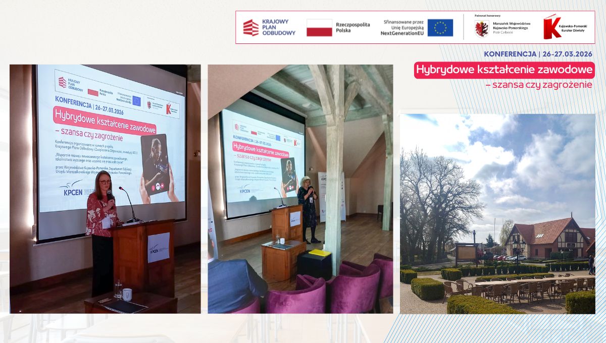 W dniach 26 i 27 marca 2026 r. spotkaliśmy się w Hotelu Pałac Poledno z uczestnikami przygotowanej przez toruński KPCEN konferencji „Hybrydowe kształcenie zawodowe – szansa czy zagrożenie” organizowanej w ramach projektu „Zbudowanie systemu koordynacji i monitorowania regionalnych działań na rzecz kształcenia zawodowego, szkolnictwa wyższego oraz uczenia się przez całe życie, w tym uczenia się dorosłych” Krajowego Planu Odbudowy i Zwiększania Odporności.