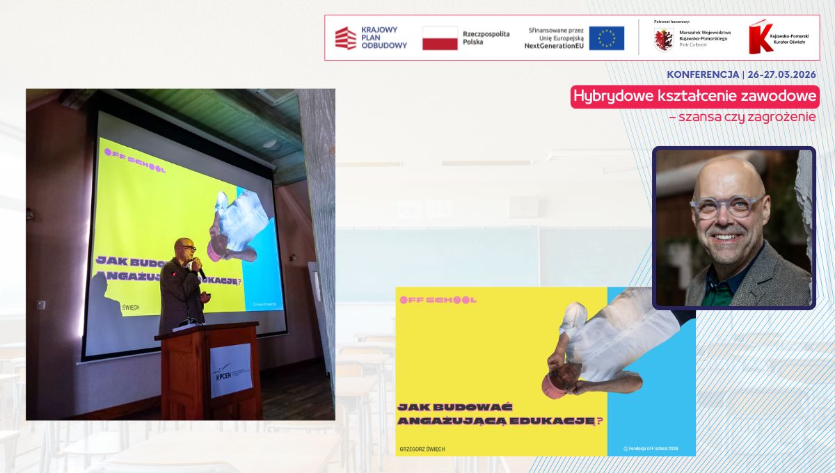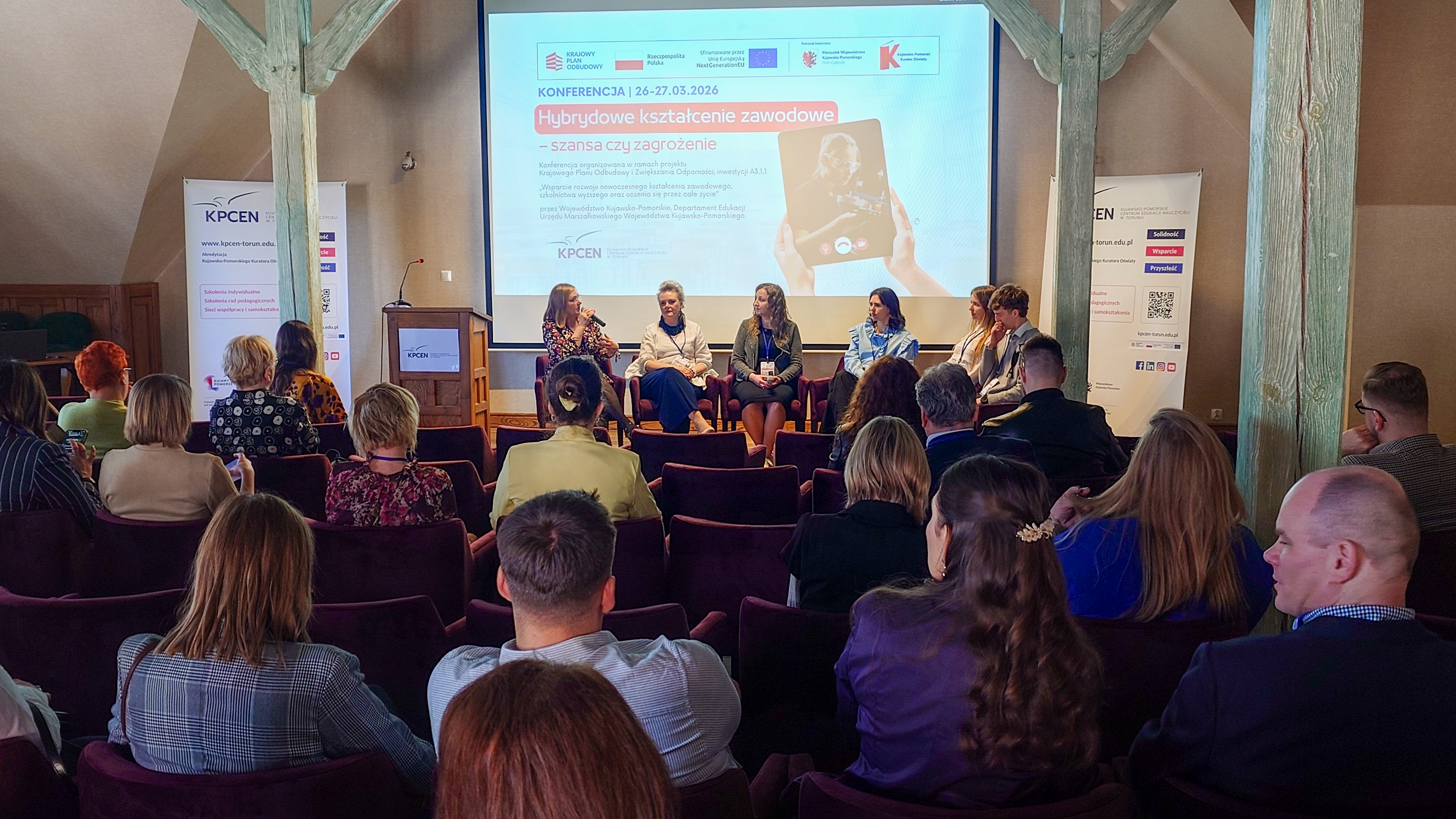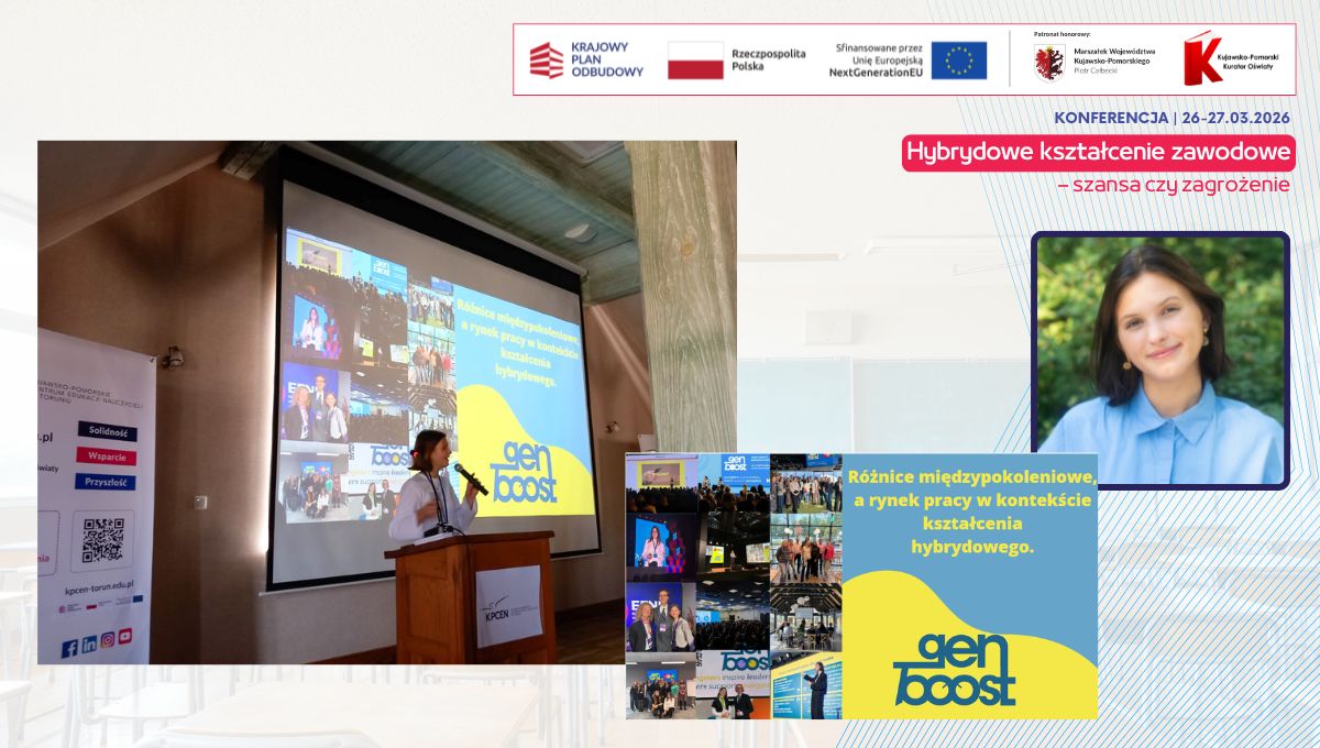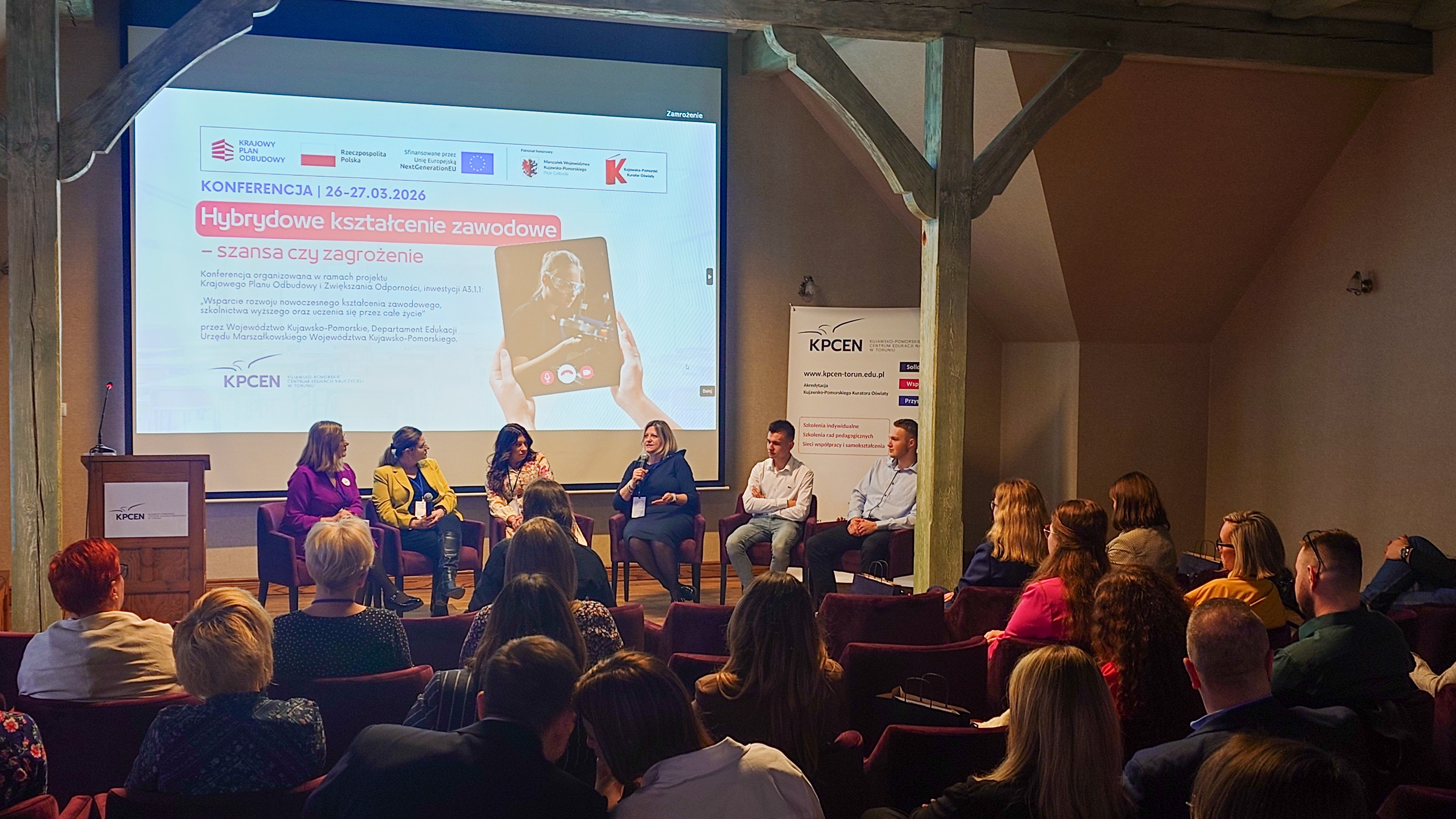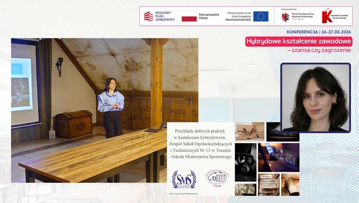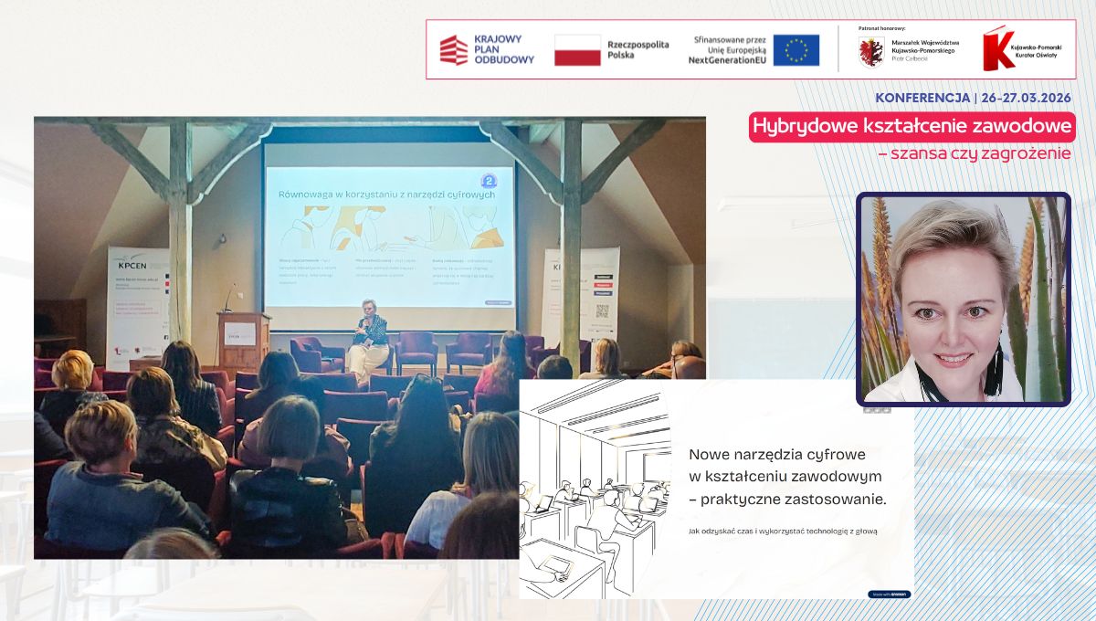 W dniach 26 i 27 marca 2026 r. spotkaliśmy się w Hotelu Pałac Poledno z uczestnikami przygotowanej przez toruński KPCEN konferencji „Hybrydowe kształcenie zawodowe – szansa czy zagrożenie” organizowanej w ramach projektu „Zbudowanie systemu koordynacji i monitorowania regionalnych działań na rzecz kształcenia zawodowego, szkolnictwa wyższego oraz uczenia się przez całe życie, w tym uczenia się dorosłych” Krajowego Planu Odbudowy i Zwiększania Odporności.