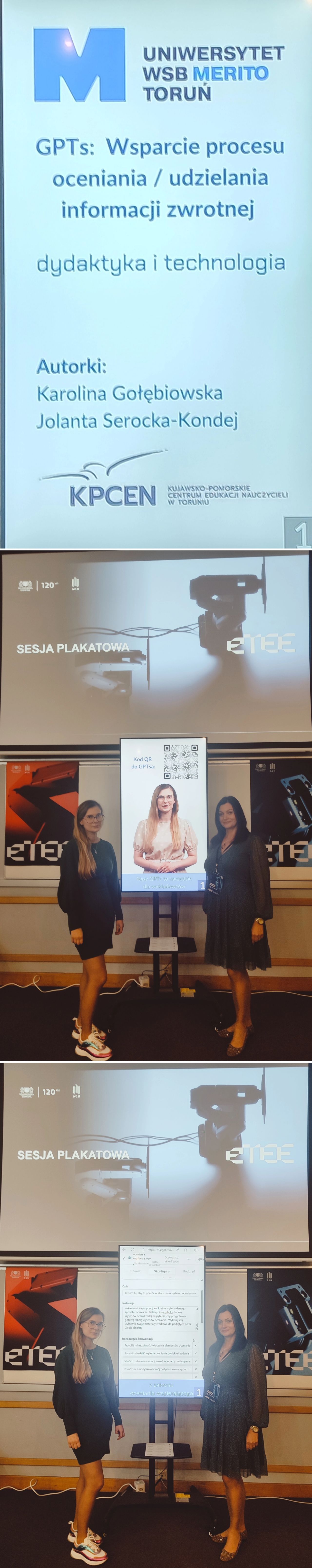 Konferencja eTEE to także przestrzeń, w której uczestniczki i uczestnicy konferencji dzielą się swoim doświadczeniem i pomysłami na wykorzystanie nowych technologii. Podczas sesji plakatowej Jolanta Serocka z Karoliną Gołębiowską, metodyczką z Uniwersytetu WSB Merito w Toruniu, zaprezentowały plakat wideo pokazujący możliwości stworzonego przez nie modelu chatbota – GPT-sa "Wsparcie procesu oceniania/udzielania informacji zwrotnej". GPT-s to narzędzie dla nauczycieli i wykładowców, pomocne w procesie oceniania wspierającego uczenie się i rozwój – w dawaniu uczniom i studentom wartościowej informacji zwrotnej. Został zasilony literaturą z zakresu oceniania wspierającego/kształtującego. W efekcie powstało praktyczne narzędzie skierowane do edukatorów, którzy chcieliby zacząć stosować elementy oceniania wspierającego, ale nie są pewni, jak to zrobić. GPT-s krok po kroku poprowadzi użytkownika przez ten proces, ułatwiając i przyspieszając go. Wygeneruje pomysły, dostosowując je do indywidualnych potrzeb. Autorki przygotowały cztery wstępne instrukcje. Projekt powstał w czasie kursu "SI jako Twój asystent dydaktyczny" Centrum Szkół Wyższych Merito. Autorki otrzymały wyróżnienie i stały się Ambasadorkami SI w dydaktyce. Poniżej kod QR, który przekierowuje do chatbota.
