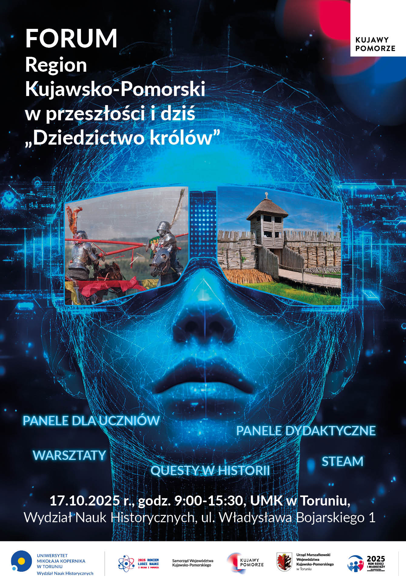 Departament Edukacji Urzędu Marszałkowskiego Województwa Kujawsko-Pomorskiego i Uniwersytet Mikołaja Kopernika w Toruniu zapraszają na jednodniowe forum historyczno-edukacyjne „Region kujawsko-pomorski w przeszłości i dziś. Dziedzictwo królów”, które odbędzie się 17 października 2025 r. od 9:00 do 15:30 na Wydziale Nauk Historycznych Uniwersytetu Mikołaja Kopernika w Toruniu, ul Bojarskiego 1. Wydarzenie skierowane jest przede wszystkim do uczniów, nauczycieli, pasjonatów oraz regionalistów.