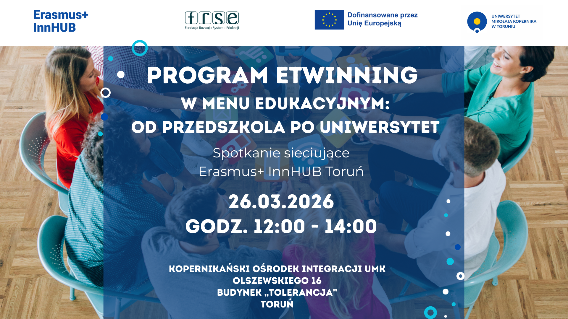Pierwsze w regionie spotkanie sieciujące organizowane przez Centrum Innowacji Erasmus+ InnHUB w Toruniu odbędzie się 26 marca 2026 r. w godzinach 12:00-14:00 w Kopernikańskim Ośrodku Integracji Uniwersytetu Mikołaja Kopernika (budynek "Tolerancja", sala na dole) przy ul. Olszewskiego 16 w Toruniu.