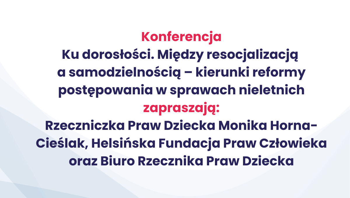 Rzeczniczka Praw Dziecka – Monika Horna-Cieślak serdecznie zaprasza do udziału w konferencji pt. „Ku dorosłości. Między resocjalizacją a samodzielnością – kierunki reformy postępowania w sprawach nieletnich". Wydarzenie współorganizują Helsińska Fundacja Praw Człowieka oraz Biuro Rzecznika Praw Dziecka.