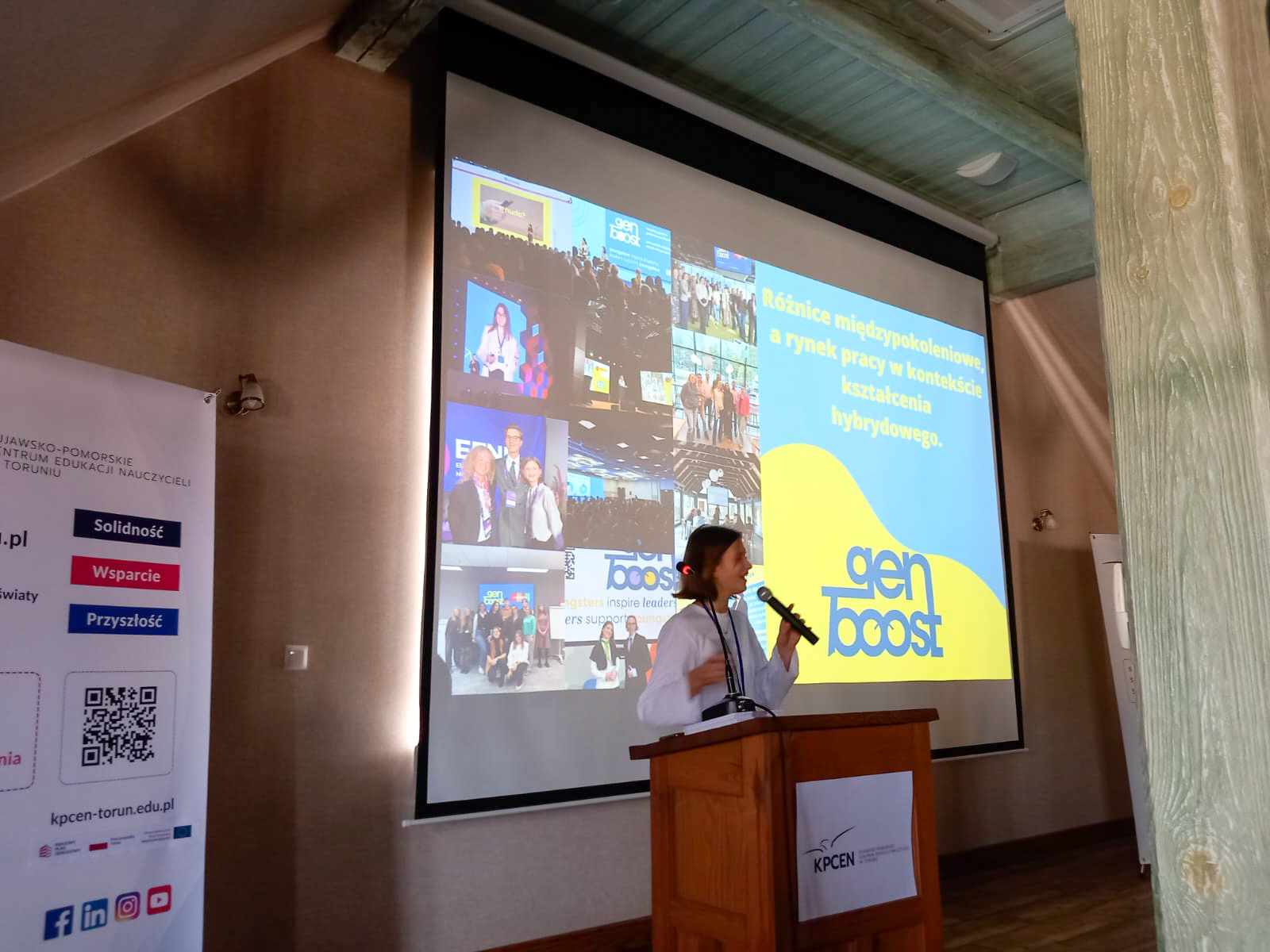 Następnie uwagę zebranych przykuła Wiktoria Nowak, współtwórczyni projektu „GenBoost" w Fundacji OFF School, który buduje mosty międzypokoleniowe w firmach, z wystąpieniem pt. „Różnice międzypokoleniowe a rynek pracy w kontekście kształcenia hybrydowego”.