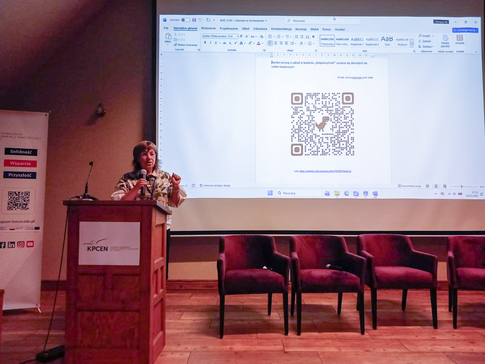 Na koniec pierwszego dnia głos zabrała dr hab. Hanna Solarczyk, prof. UMK, która zachęciła uczestników konferencji do udziału w badaniu Adaptacyjność uczenia się dorosłych do celów naukowych. Pierwszy dzień obrad podsumował Sławomir Żebrowski. Wręczył także podziękowania dla Elizy Kaczmarek, dyrektor Departamentu Edukacji Urzędu Marszałkowskiego Województwa Kujawsko-Pomorskiego w Toruniu, Beaty Więckowskiej, wicedyrektor Departamentu Edukacji Urzędu Marszałkowskiego Województwa Kujawsko-Pomorskiego w Toruniu, Urszuli Musiatowicz, koordynator projektu z ramienia Departamentu Edukacji Urzędu Marszałkowskiego Województwa Kujawsko-Pomorskiego w Toruniu, Sylwii Meller, pracownika Biura Projektu z ramienia Departamentu Edukacji Urzędu Marszałkowskiego Województwa Kujawsko-Pomorskiego w Toruniu, w uznaniu za życzliwość, wsparcie instytucjonalne oraz zaangażowanie w realizację cyklu konferencji zorganizowanych w ramach projektu „Wsparcie rozwoju nowoczesnego kształcenia zawodowego, szkolnictwa wyższego oraz uczenia się przez całe życie”, finansowanego ze środków Krajowego Planu Odbudowy i Zwiększania Odporności w latach 2024-2026.