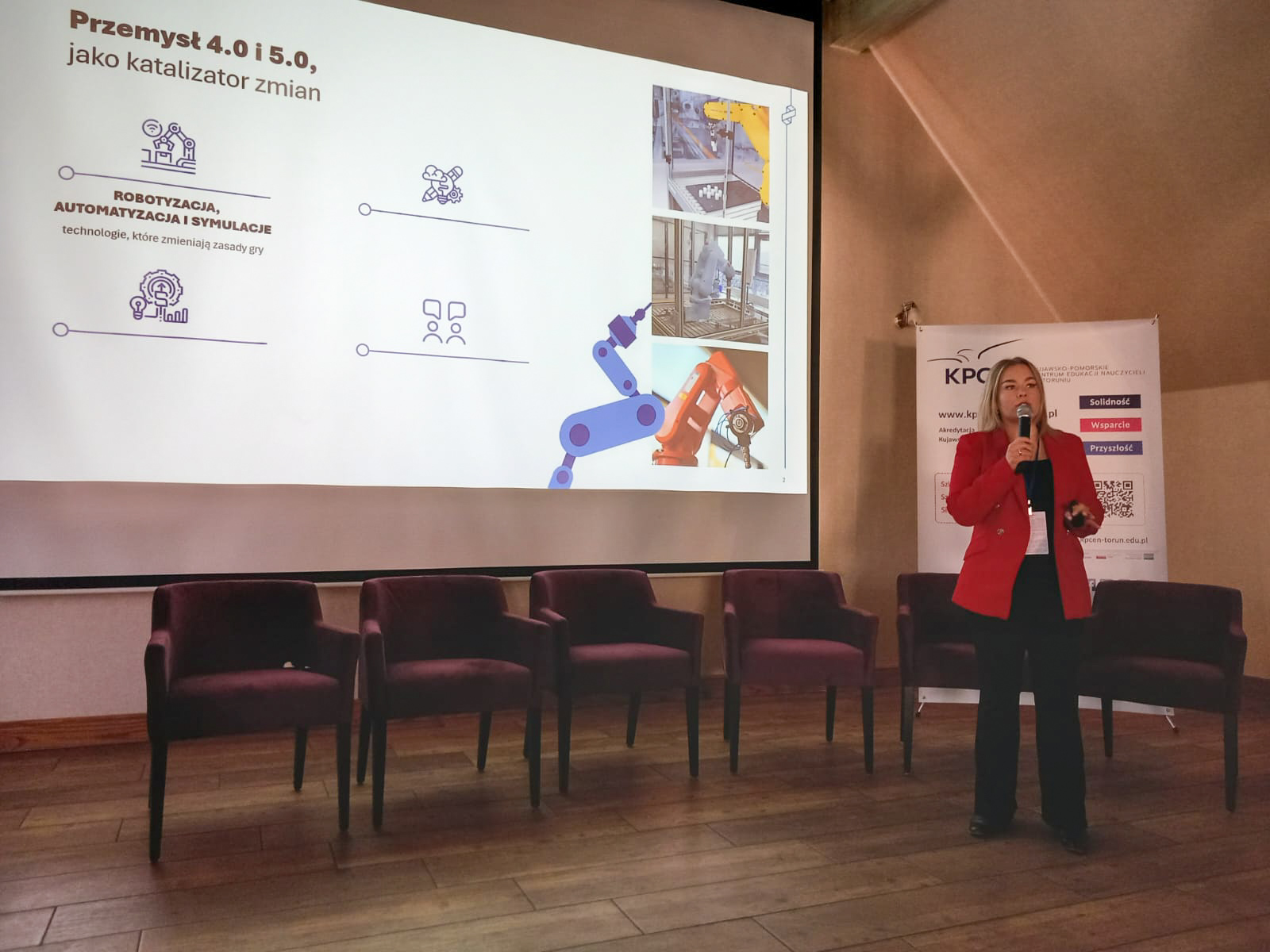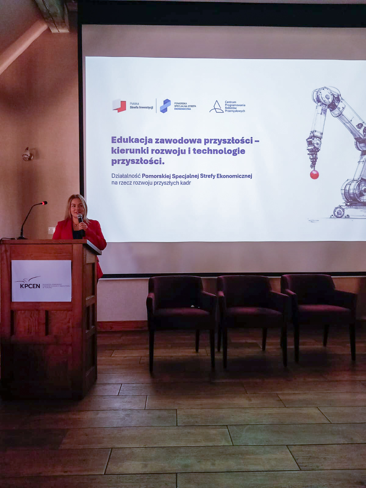 Wystąpienie przybliżyło wizję edukacji zawodowej przyszłości jako hybrydowego ekosystemu, w którym zaawansowane technologie stają się codziennością. Na przykładzie działalności Pomorskiej Specjalnej Strefy Ekonomicznej i naszych Centrów Programowania Robotów Przemysłowych prelegentka pokazała, jak w praktyce łączymy nowoczesny świat z realnym przemysłem, kształcąc kadry gotowe na wyzwania przemysłu przyszłości.