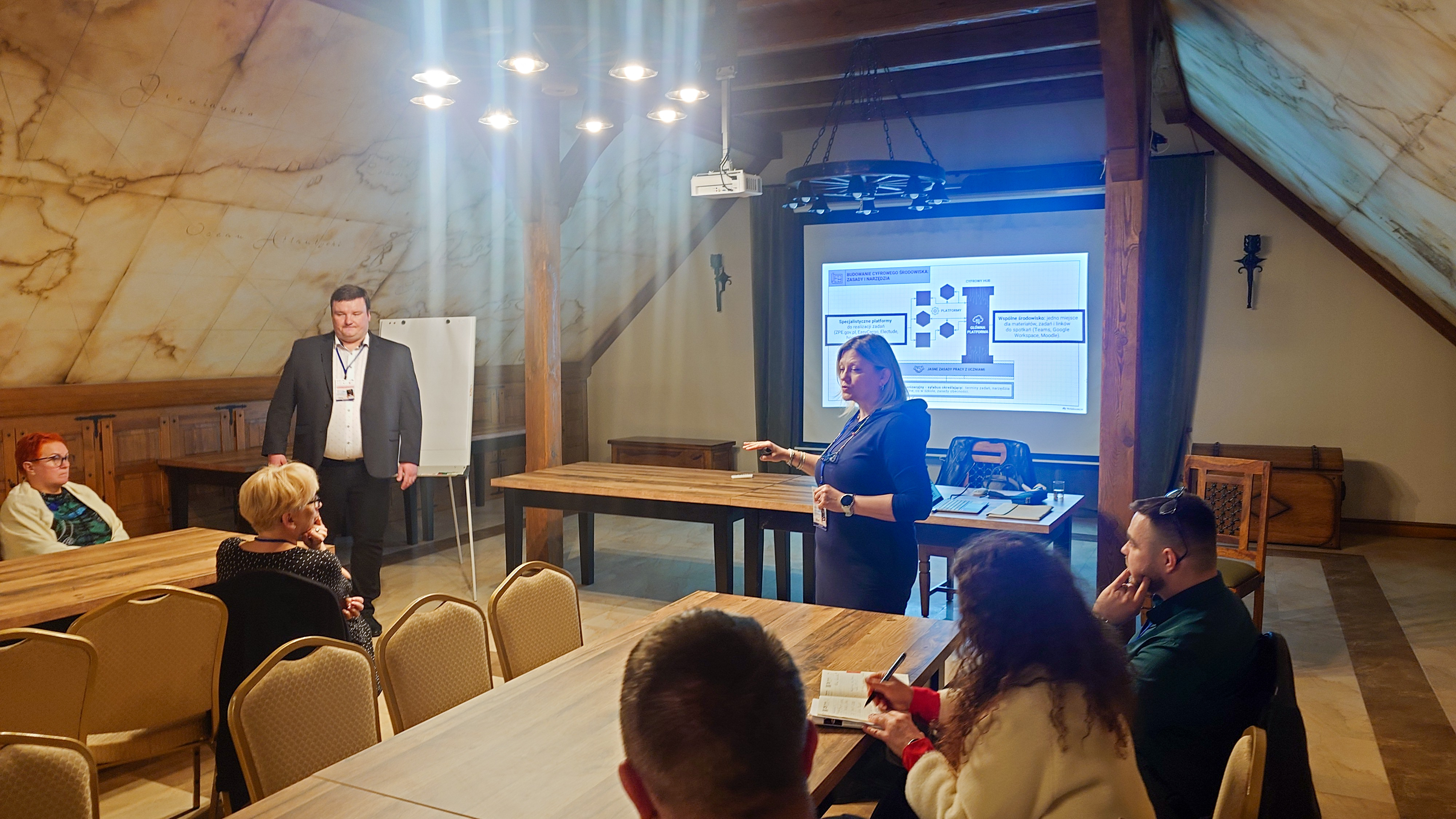 Trzecie warsztaty – „Przykłady dobrych praktyk w kształceniu zawodowym. Szkoła i pracodawca w erze hybrydowej” – poprowadzili Aleksandra Łuczak,nauczycielka przedmiotów zawodowych, religii oraz informatyki, oraz Maciej Nowak, nauczyciel przedmiotów zawodowych teoretycznych i praktycznych.
