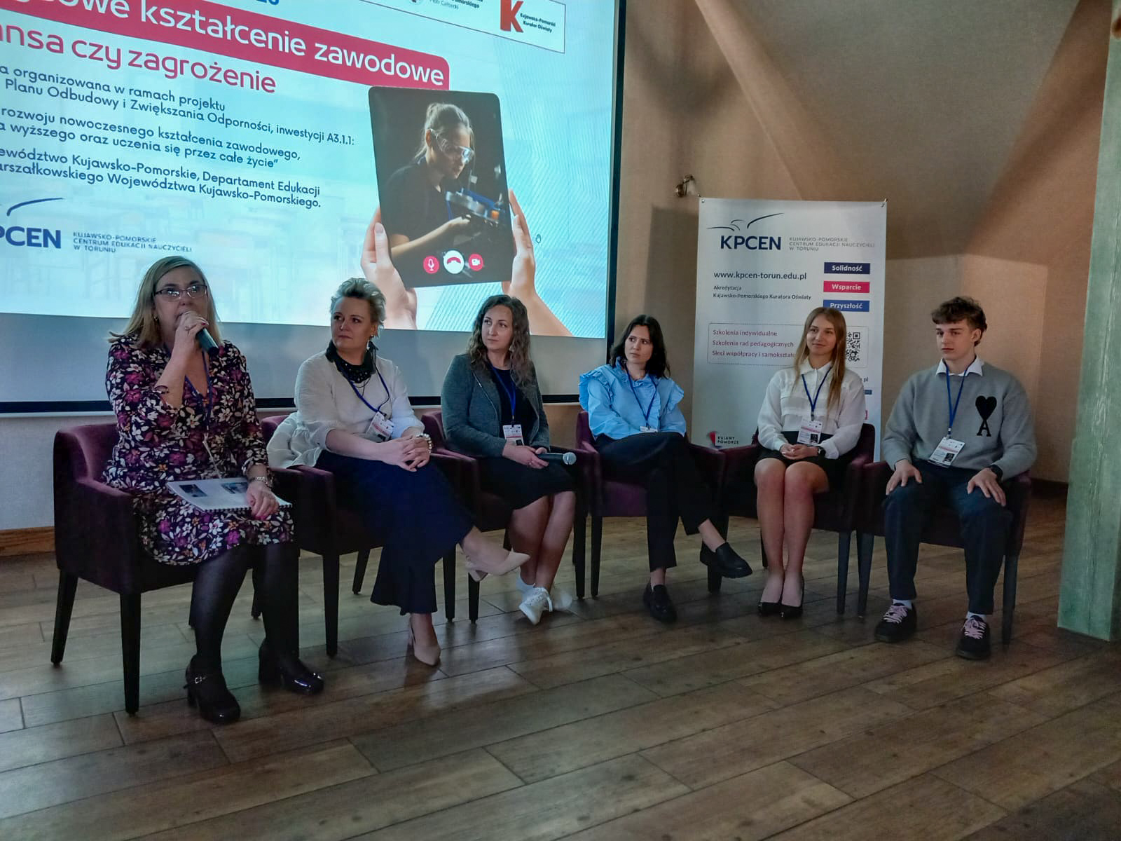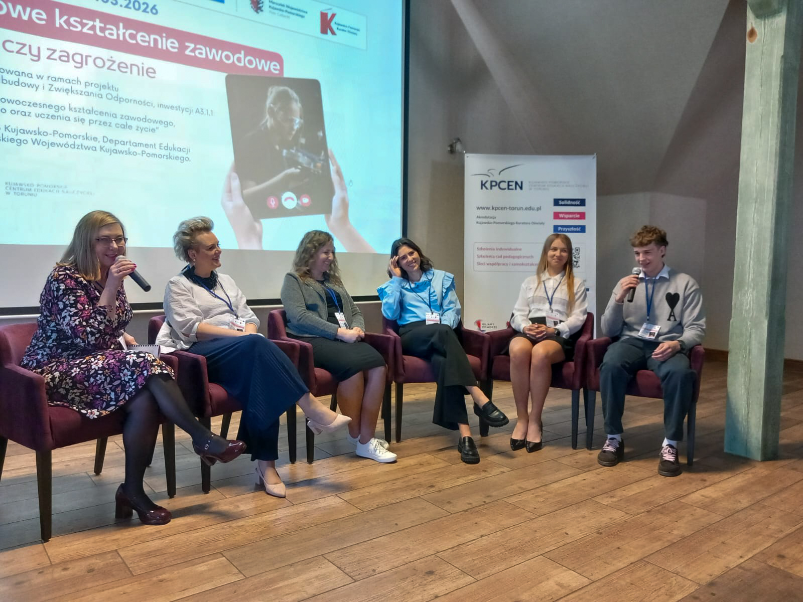 Część wykładową zamknął panel dyskusyjny „Szansa czy zagrożenie? Głos nauczycieli, uczniów i pracodawców”, który poprowadziła Dorota Andrzejewska z KPCEN w Toruniu. W rozmowie udział wzięły prelegentki: Małgorzata Laszenko, Wiktoria Kin i Aleksandra Łuczak oraz Sebastian Krzemiński i Bartosz Bukowski, uczniowie klasy IV w zawodzie technika transportu drogowego w Zespole Szkół Samochodowych w Toruniu.